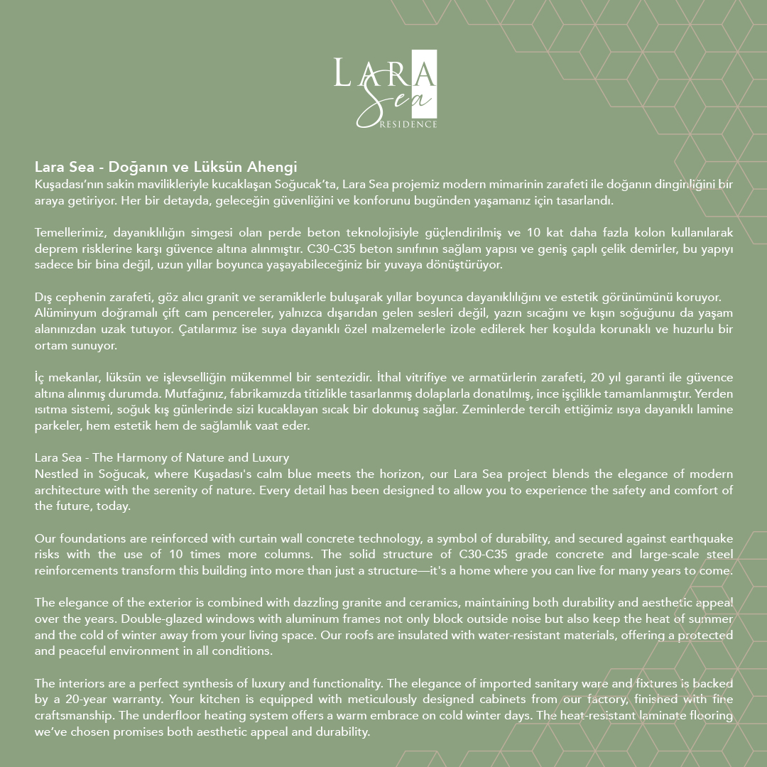 Kuşadası’nın sakin mavilikleriyle kucaklaşan Soğucak’ta, Lara Sea projemiz modern mimarinin zarafeti ile doğanın dinginliğini bir araya getiriyor. Her bir detayda, geleceğin güvenliğini ve konforunu bugünden yaşamanız için tasarlandı.